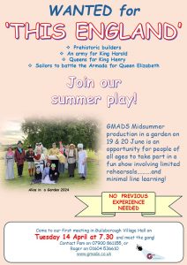 Many of you will remember our production of Alice in a Garden in 2024. Following its success, we are planning a summer production in a village garden on 19 & 20 June.  “This England” is a quirky retelling of key events from England’s story up to Tudor times.